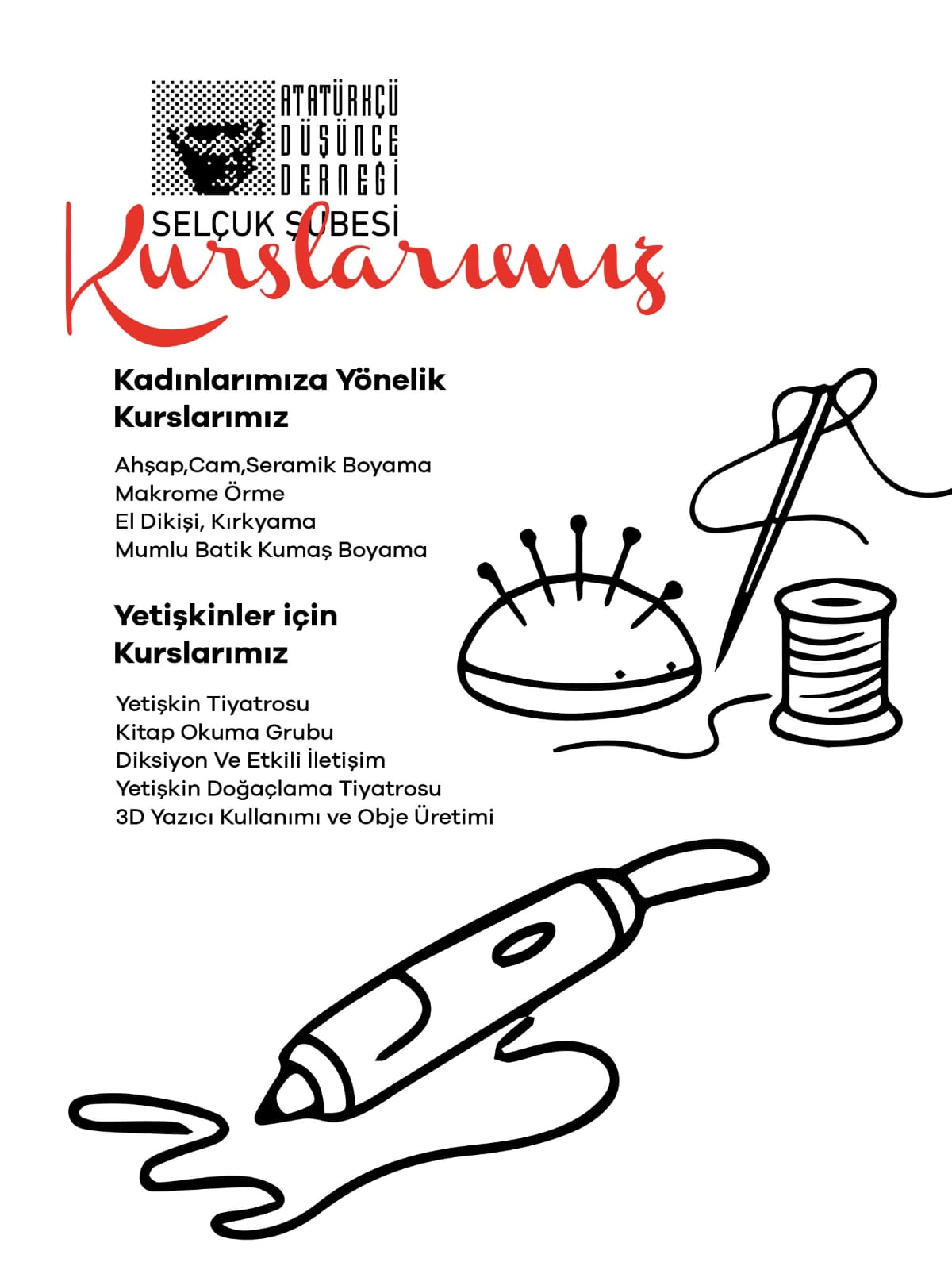 Atatürk ilke ve devrimleri ışığında toplumsal gelişime katkı sağlamayı hedefleyen ADD Selçuk Şubesi, yeni dönem kurs programını kamuoyuna açıkladı. Alanında yetkin eğitmenler ve usta sanatçılar eşliğinde gerçekleştirilecek eğitimlerde; geleneksel el sanatlarından modern teknolojiye, sahne sanatlarından müziğe kadar geniş bir yelpaze sunuluyor.