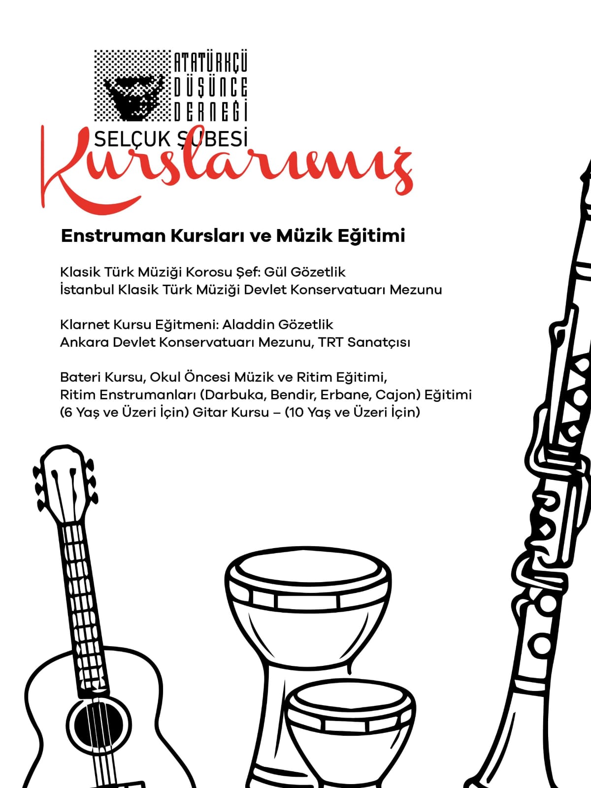 Selçuk Atatürkçü Düşünce Derneği (ADD) Selçuk Şubesi, Cumhuriyet değerlerini sanat ve bilimle buluşturan kapsamlı bir eğitim programını hayata geçiriyor. "Çağdaş, bilimsel ve laik eğitim" vurgusuyla duyurulan kurslar; çocuklardan yetişkinlere kadar her yaş grubuna hitap ediyor.