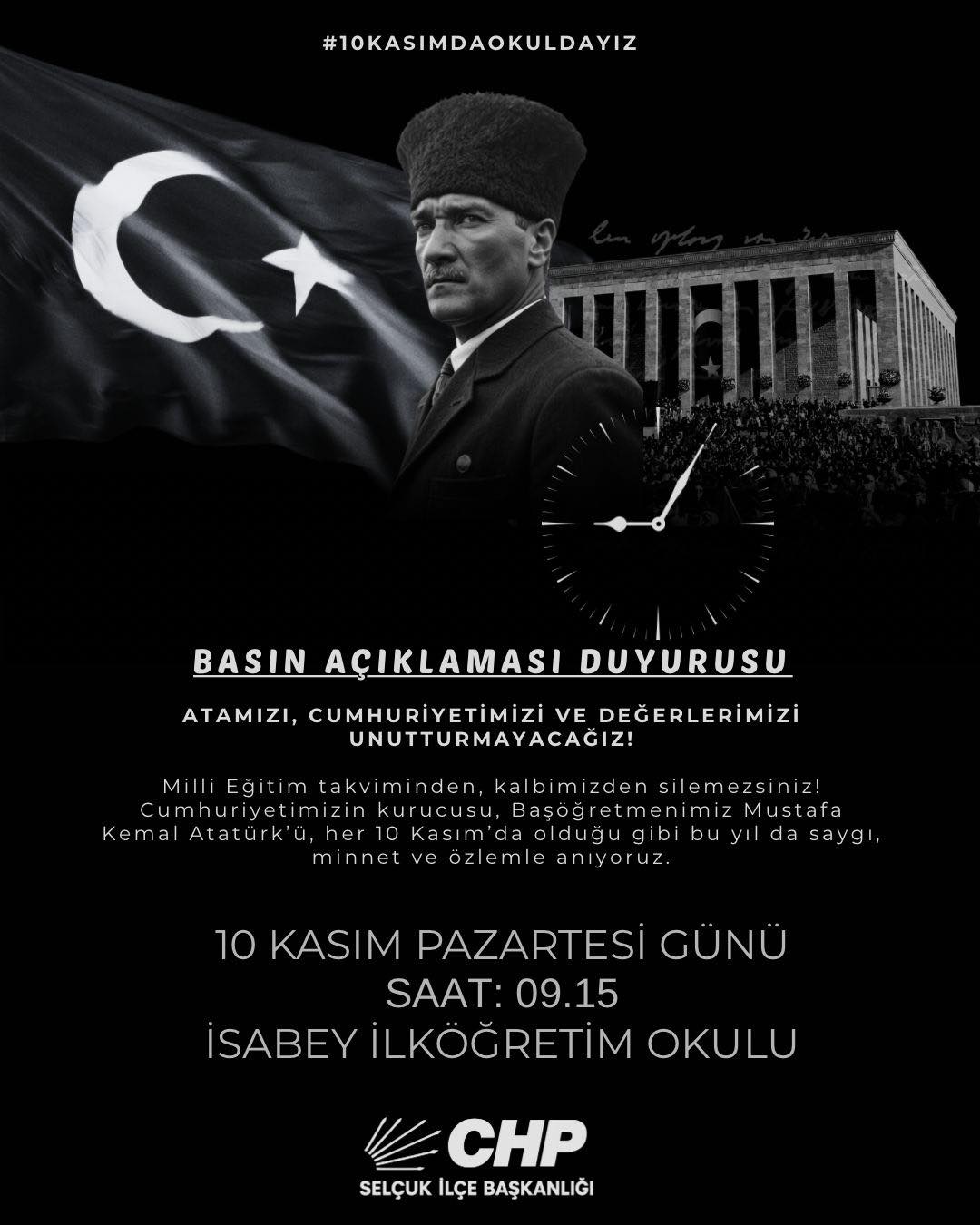 İlçe Başkanlığı’ndan yapılan açıklamada, “Atatürk’ün okullarda anılmadığı bir eğitim yılı kabul edilemez” ifadelerine yer verildi. CHP Selçuk İlçe Örgütü, resmi törenlerin yanı sıra 10 Kasım Pazartesi günü saat 09.15’te İsabey İlköğretim Okulu önünde bir basın açıklaması yapacaklarını duyurdu.
