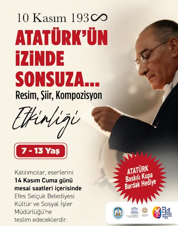 Çocukların Atatürk sevgisini ve Cumhuriyet bilincini sanat aracılığıyla ifade etmelerini destekleyen Efes Selçuk Belediyesi, 10 Kasım Atatürk’ü Anma Günü dolayısıyla çocuklara yönelik “Atatürk’ün İzinde Sonsuza...” temalı resim, şiir ve kompozisyon etkinliği düzenliyor.