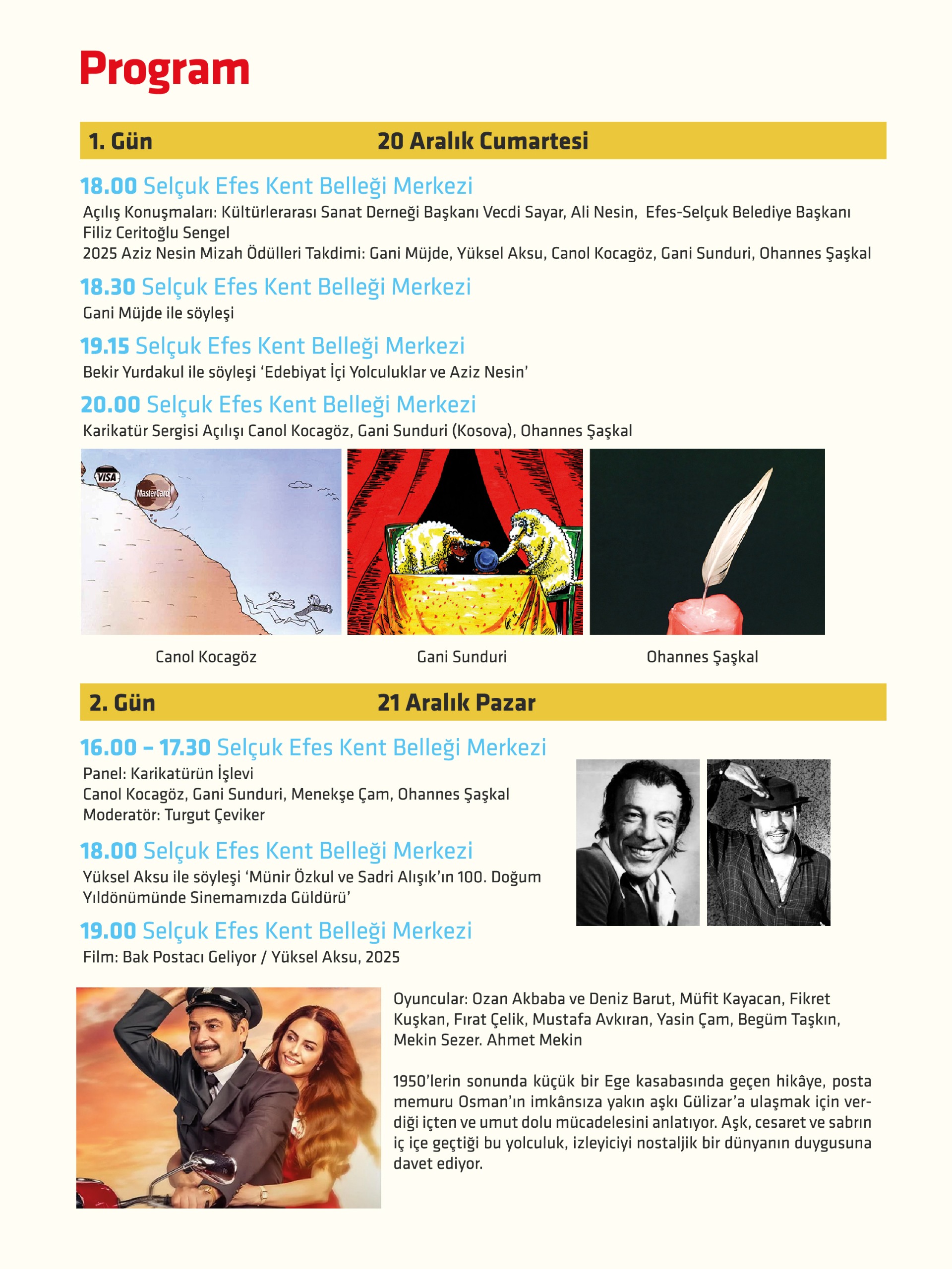 Açılışın ardından, sanat dünyasının usta isimleri Gani Müjde, Yüksel Aksu, Canol Kocagöz, Gani Sunduri ve Ohannes Şaşkal’a 2025 Aziz Nesin Mizah Ödülleri takdim edilecek. Saat 18.30’da Gani Müjde, 19.15’te ise Bekir Yurdakul “Edebiyat İçi Yolculuklar ve Aziz Nesin” başlıklı söyleşilerle izleyicilerle buluşacak.