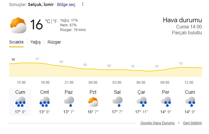Özellikle Selçuk (Efes) bölgesinde Cumartesi günü öğle saatlerinden itibaren yağışın etkisini artırması bekleniyor. Tahminlere göre Selçuk’ta gün boyu sıcaklıklar 10-18 derece bandında seyredecek ancak nem oranının yüksekliği ve rüzgarın hızı açık alan faaliyetlerini olumsuz etkileyebilir.