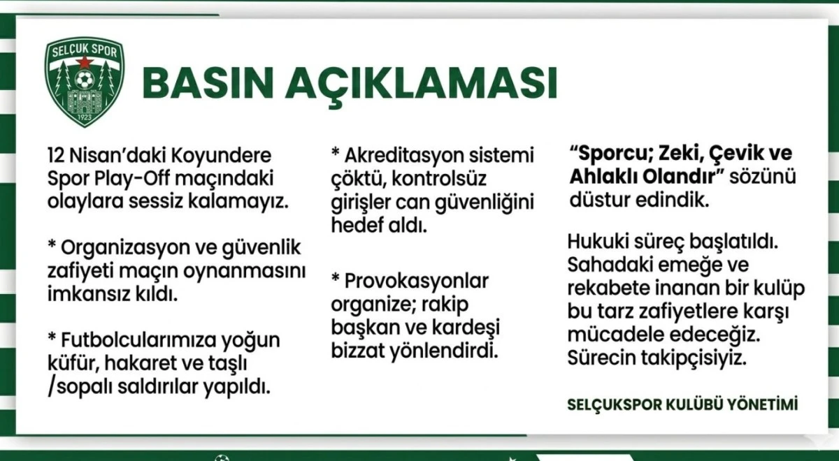 Selçukspor Kulübü olarak, 12 Nisan Pazar günü Menemen Koyundere Spor ile oynanan Süper Amatör Lig Play-Off karşılaşmasında yaşanan olaylara ilişkin sessiz kalmamız mümkün değildir.