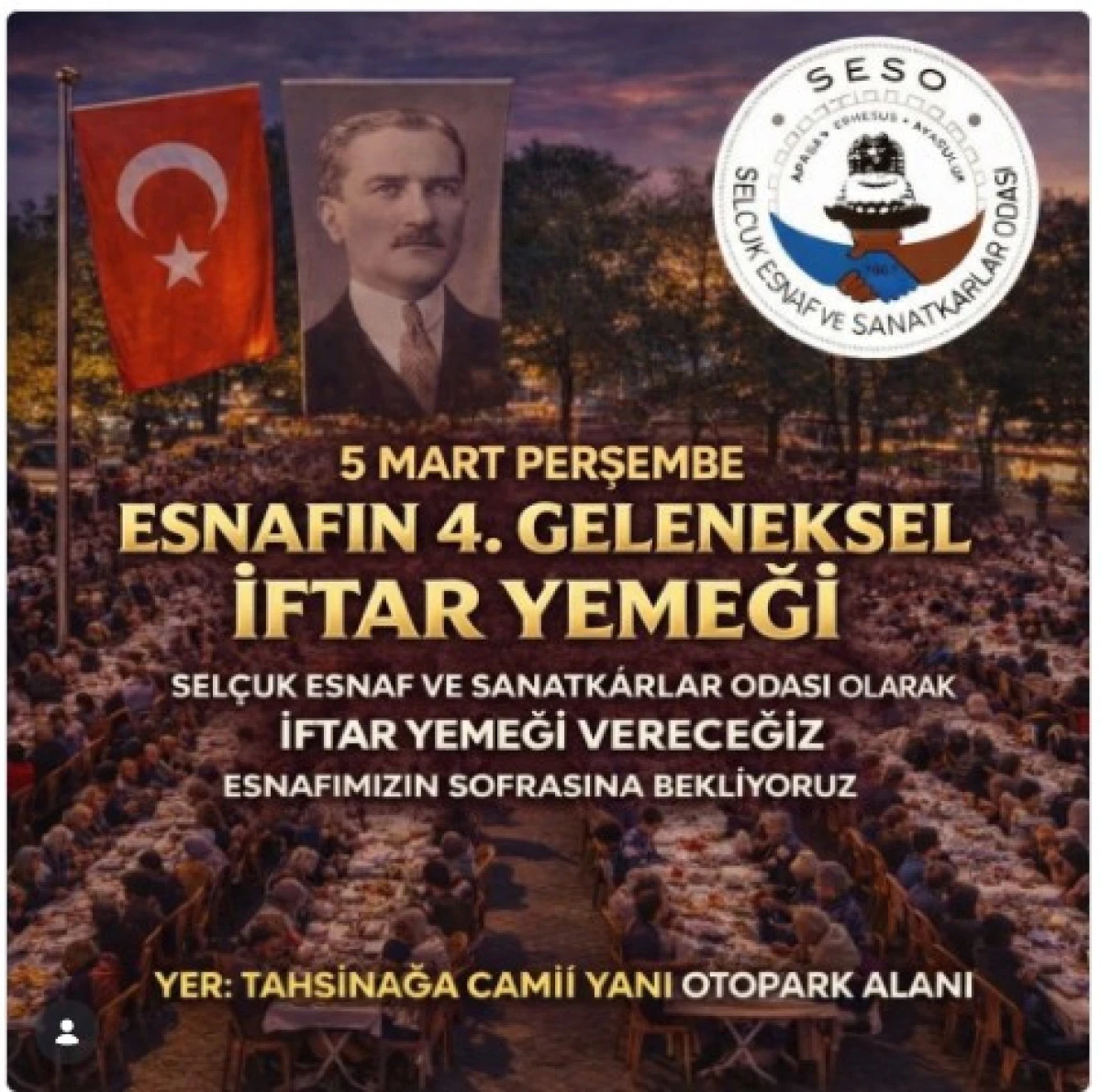 Selçuk Esnaf ve Sanatkarlar Odası (SESO) olarak, birliğimizin ve beraberliğimizin en güzel simgelerinden biri haline gelen geleneksel buluşmamızı bu yıl da gerçekleştirmenin heyecanını yaşıyoruz.