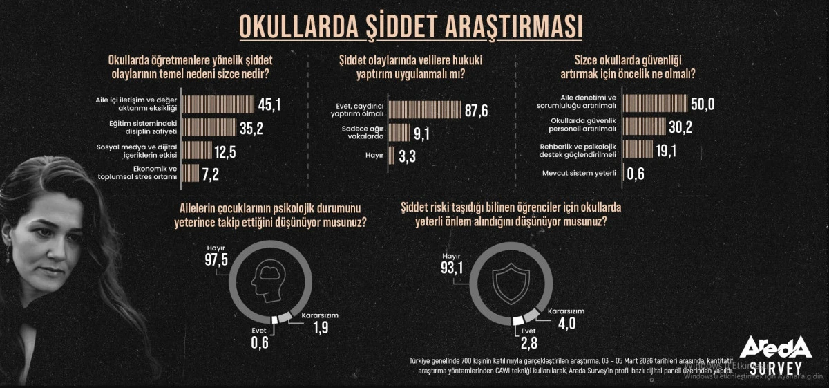 Areda Survey’in gerçekleştirdiği son araştırma, Türkiye genelinde toplumun yüzde 87,6’sının okullarda yaşanan şiddet olayları nedeniyle velilere hukuki yaptırım uygulanmasını istediğini ortaya koydu. Halkın %97,5'ine göre aileler çocuklarının psikolojisini takip etmiyor.